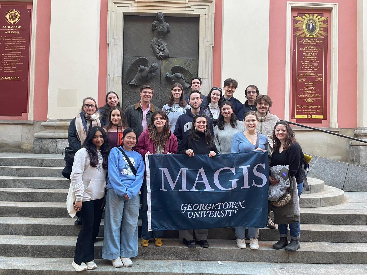 Spring 2026 marked the first-ever Neighbors and Strangers: Catholic-Jewish Encounters to Poland, a Magis Immersion Seminar to Poland taught by Professor Anna Sommer from the Center for Jewish Civilization and Rabbi Ilana Zietman, Director for Jewish Life. Alongside 14 of their fellow students, Avanthika Suryadevara (H’27) and Ella Montano (C’28) traveled through Warsaw, Lublin, Oświęcim, Kraków, and many places in between, each stop offering its own story to uncover. Their days consisted of walking tours of former Jewish ghettos, Catholic churches, quiet reflection in museums, and guided visits to concentration and extermination camps. They encountered not only the facts of history, but the weight of it—standing in places where the darkest chapters of human experience unfolded. Yet, in conversations with each other and with members of the Polish community, the students also found moments of connection, resilience, and hope.